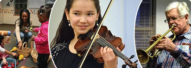Meet faculty and ask questions. Take a tour, try an instrument or sample an early-childhood class. Learn about the benefits of music therapy, listen to live music and enjoy free refreshments! Sign up on the spot for programs and lessons or take home material to read more.