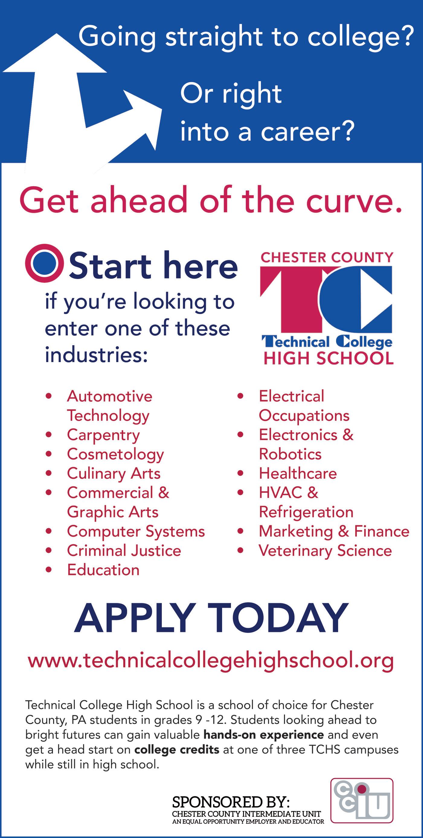 For years, career and technical high schools have been painted as an alternative to the college track, so it may come as a surprise to some that as much as 80 percent of students at a Chester County Technical College High School (TCHS) go on to some form of postsecondary education, be it a two- or four-year college or a careerspecific institution like nursing school.