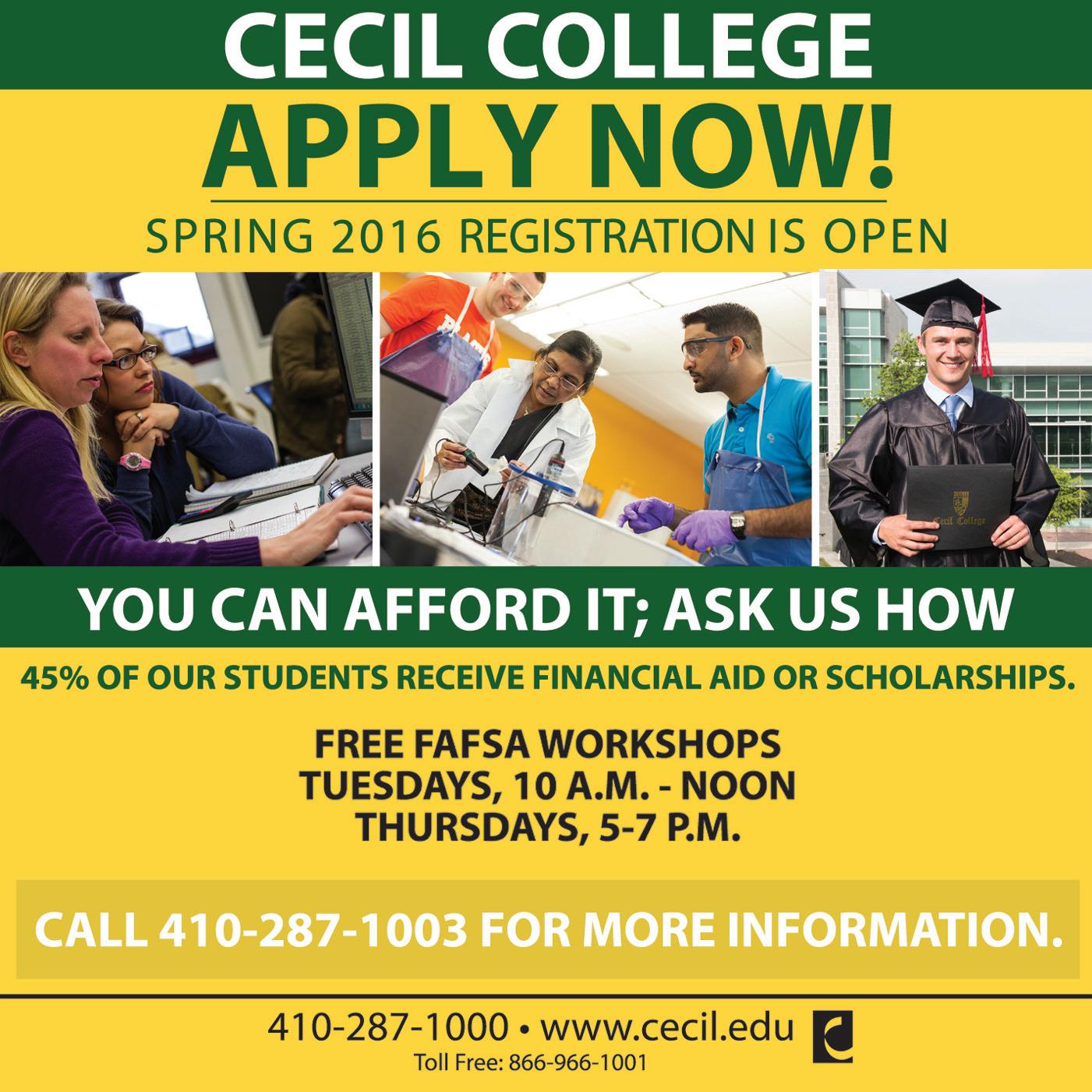 courses are offered online or in condensed and accelerated formats. Cecil also has advising and career planning services as well as job placement assistance. Programs include degrees in business administration, business and commerce technology, computer science, criminal justice, education, equine studies, general studies, horticulture science, visual communications, social work, biology, engineering, mathematics and physics. Students can also enroll in one of Cecil’s certificate programs to prepare for a new career such as government contracting. In addition, Cecil has continuing education classes to help students stretch their minds and bodies. For more information, visit www.cecil. edu or call 410-287-1000.