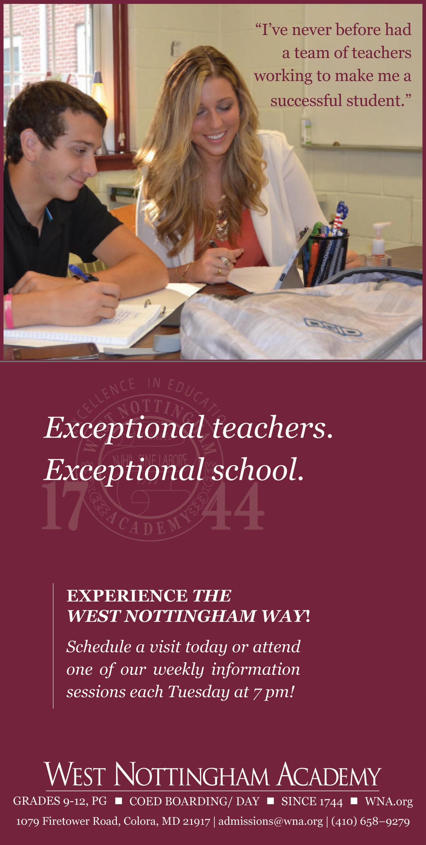 West Nottingham Academy (WNA) the oldest boarding school in America, is close to Chester County’s south-western border. Founded in 1744 by Reverend Samuel Finley, who went on to become president of what is now Princeton University, WNA numbers among its distinguished alumni signers of the Declaration of Independence, the co-founder of the University of Pennsylvania Medical School, renowned contemporary artist Eric Fischl, and numerous other notable individuals. Offering both boarding and day opportunities, WNA is located about five miles past the MD-PA border off Route 1 in Colora, Maryland. Day students from the Oxford Area School District and Solanco are, by law, eligible for free bus transportation to and from the Academy. WNA is also readily accessible from many points in the Avon Grove, Octorara, and Kennett school districts as well as from Newark, De. Today, WNA enrolls approximately 130 students in grades 9-12, Forty percent of the student body is from countries outside the United States. For families considering a boarding school for their child, WNA offers a unique choice within close driving distance to northern Chester, Montgomery, and Berks Counties, as well as the Philadelphia area. WNA offers a good value compared to comparable independent schools on the Main Line and in Wilmington, DE. Students receive a quality college preparatory curriculum in a nurturing environment, as well as two unique programs.