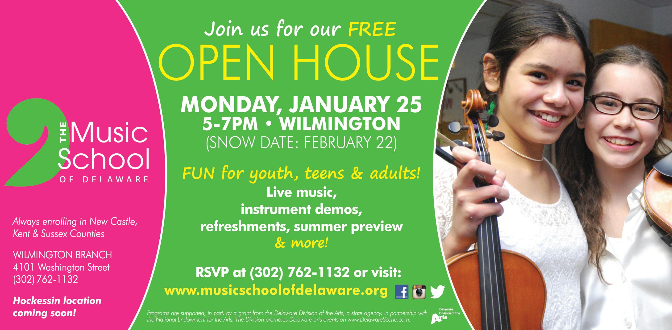 The Music School’s Open House is free and all are welcome! Stop by and visit us Mon., Jan. 25, from 5 to 7 p.m. at our Wilmington Branch, 4101 Washington Street, Wilmington, DE 19802. (The snow date is Feb. 22.)