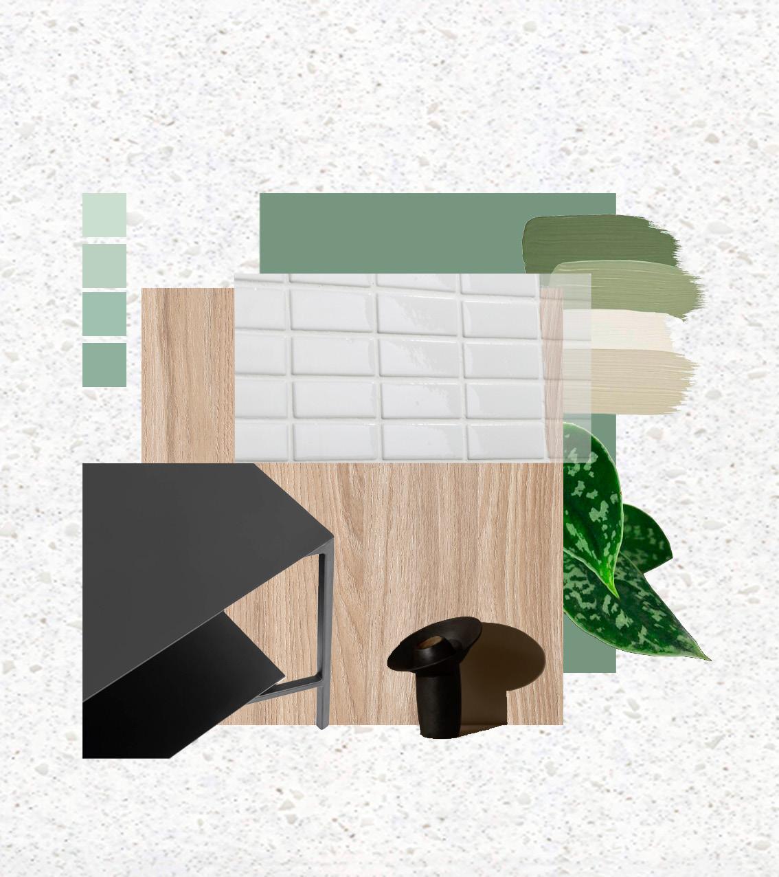 En el tema de colores se seleccionó el Pantone 335 que a partir de ahí se empieza la exploración de otros materiales como la madera y la cerámica blanca, siendo unos aliados para su conjunto como se muestra en el mood board.