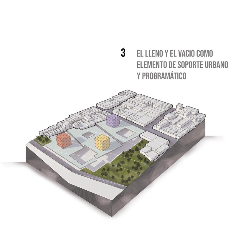 Dentro de las primicias a utilizar es conservar la escala del paisaje urbano, los apartamentos se agrupan en 3 bloques y cada uno tiene una altura de 3 pisos