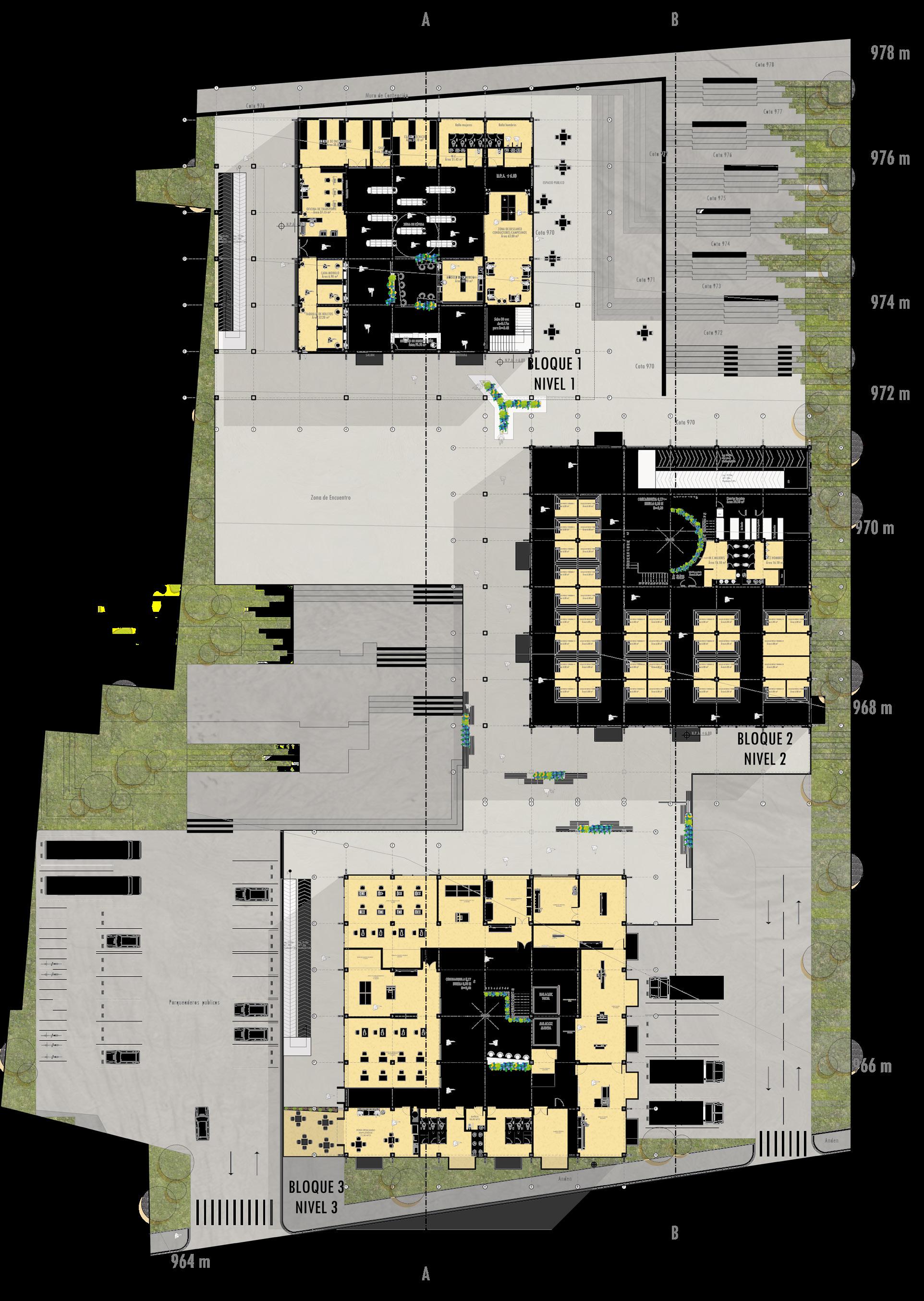 Cuenta con un pasillo que brinda acceso al punto fijo y finalmente al llegar al primer nivel y segundo se encuentra una relación con la calle, es importante su entorno urbano, ya que el municipio no cuenta con espacio público efectivo y zonas verdes, el proyecto plantea un parque y zonas comunes, pero queda en fase de viabilidad.