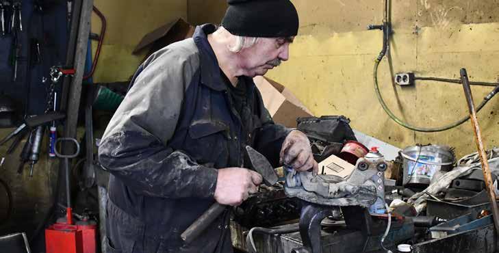 på dem. Gamla bilar klarar inte 40-50 000 mil. Franska bilar har oftast fel. T ex Renault har en liten grej under ratten som leder till airbagen och som måste åtgärdas. Jag föredrar originaldelar även om piratdelar är billigare. Men det blir bättre om än lite dyrare. Det är mest jobb här inför besiktning, men också kamremsbyten och jobb med plåtskador. Mitt råd är att inte köpa en begagnad bil från södra Sverige. Det kan bli dyra bilar med rost från saltade vägar. Saltet är som att få batterisyra på byxorna, säger