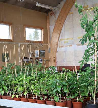 där vi odlar potatis, vitlök, lök rödbetor och morötter. En del bär köps in för vi hinner inte plocka själva, men de ska vara väl rensade då. Tomater är mitt stora intresse. Jag har alltid odlat det, men jag visste inte tidigare att det fanns så många sorter. Nu pågår experiment med ”vulkantomater”.