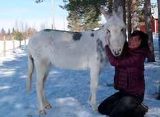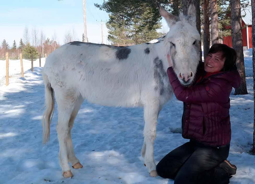 – De två åsnorna här är mamma och dotter. Våra åsnor gillar egentligen inte snön, för de har ingen tät päls, men de tycker ändå om att springa i snön. De är roliga och nyfikna och jag är fascinerad av dem. Det går inte att tvinga en åsna till nånting, man måste ha stort tålamod med dem och vinna deras förtroende. Här tar vi också emot barn med funktionshinder, och de kan vara med djuren, borsta dem, klappa dem och rida barbacka eller promenera i lugn takt med åsnorna. – Vi hade besök av en god vän