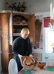 Gamla träkärl och bondeföremål fyller hörnskåpet. Renlyckan, f d Färnlöfs, mitt Ramsele.