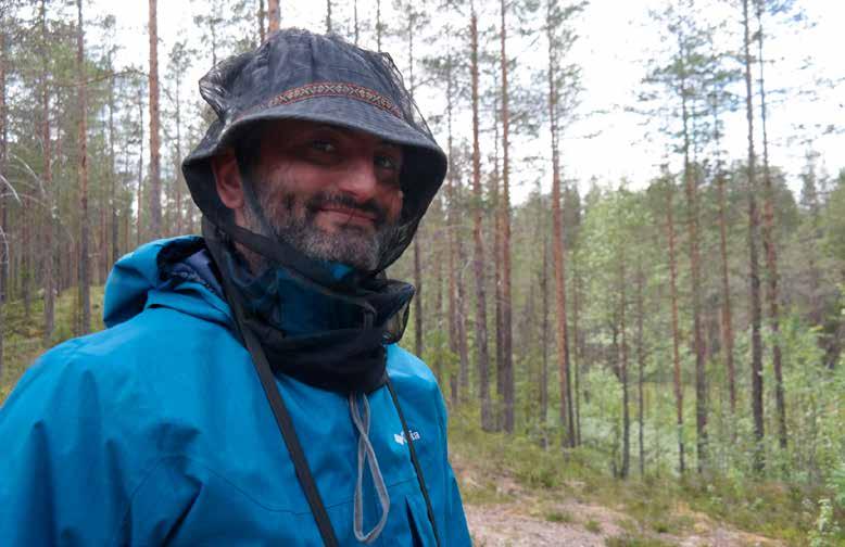 skydd mot mygg och väta. Gömslet ligger vid en myr, mitt i ett urskogsreservat. Hans stora kamera får stanna vid campen, den låter för mycket.