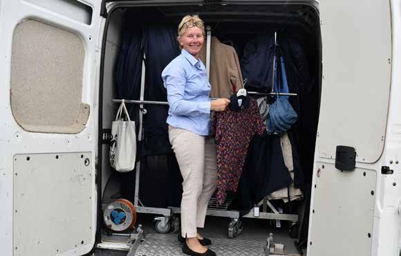 En buss kommer lastad med kläder och Aina Sundbaum i Seniorshopen. Foto: Inger Kraft Etzler.