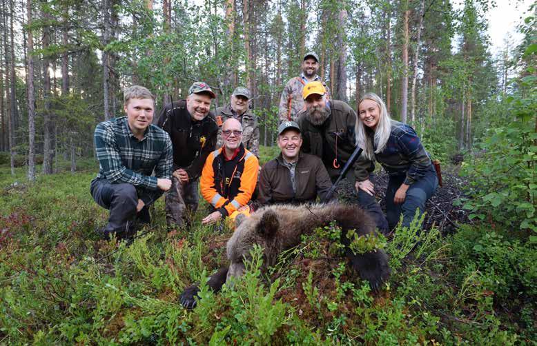 Morgan Lagerqvist från Småland, sittande bakom björnen, fick skjuta första björnen för Gålvattenbergets jaktlag. Foto: Emilia Nilsson