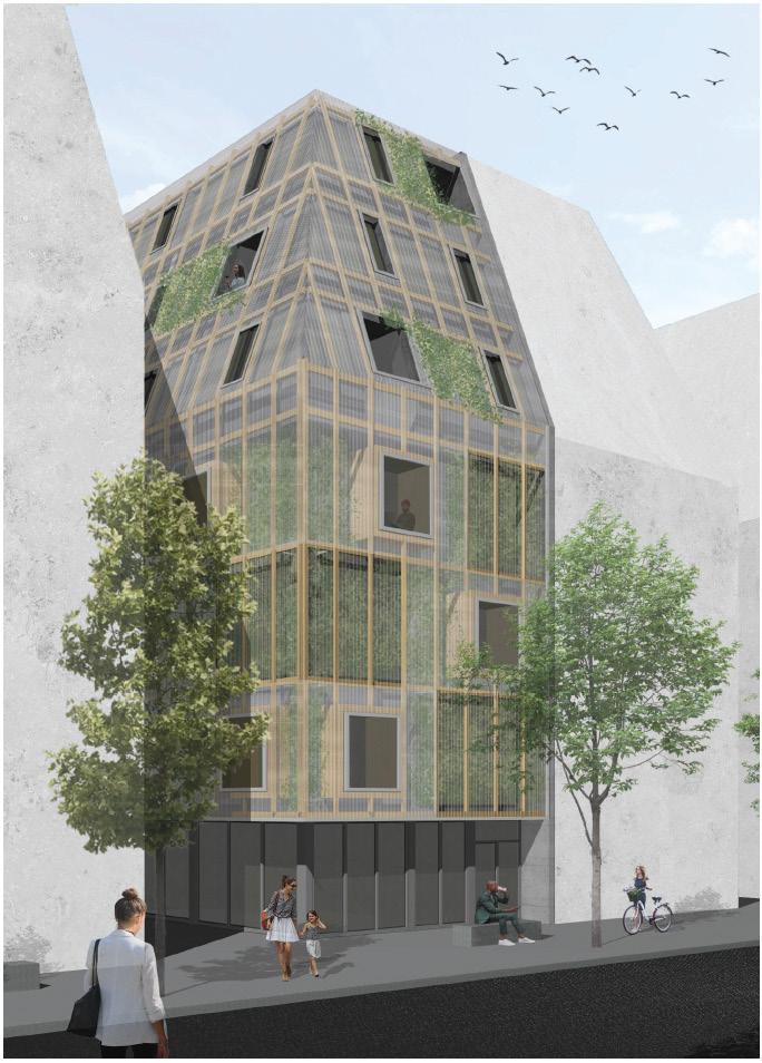The Greenhouse project aims to address climate change challenges by designing a Passive House. Utilizing the recycled materials polycarbonate panels and RE concrete aligns with the Cradle to Cradle principle. The concept focuses on creating spaces with optimal light and greenery, achieved through a dual-facade system and buffer zone for natural cooling and insulation. The organization emphasizes multi-purpose use, open floor plans with zoning through opake polycarbonate surfaces or curtains, promoting natural light and privacy. The steel-reinforced concrete frames support the structure, while a central ventilation system complements natural cooling. Sun protection measures are integrated, with year-round vegetation. Maintenance platforms ensure the integrity of the green facade. In summary, the Greenhouse project should be an approach to sustainable architecture, balancing environmental responsibility with modern living standards.