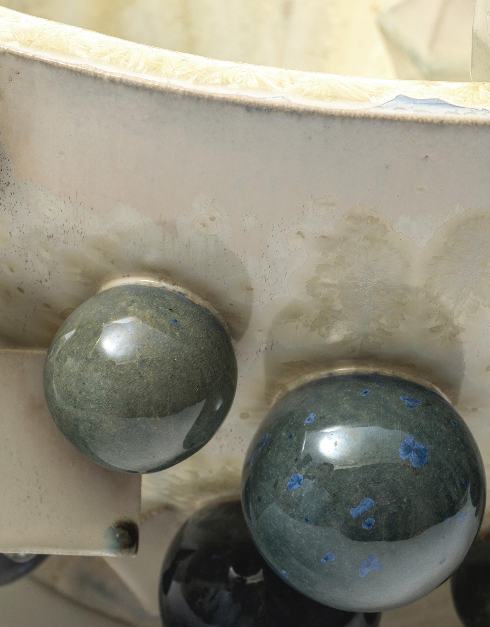 Crystals form in the glaze because of an oversaturation of solutions. This process is similar to the natural formation of diamonds, emeralds and even coal, growing in the Earth’s crust. I typically use two base glazes that I colour to gain a vast palette of possibilities. One is opaque and the other is transparent, and each form crystals in their glassy molten matrix .