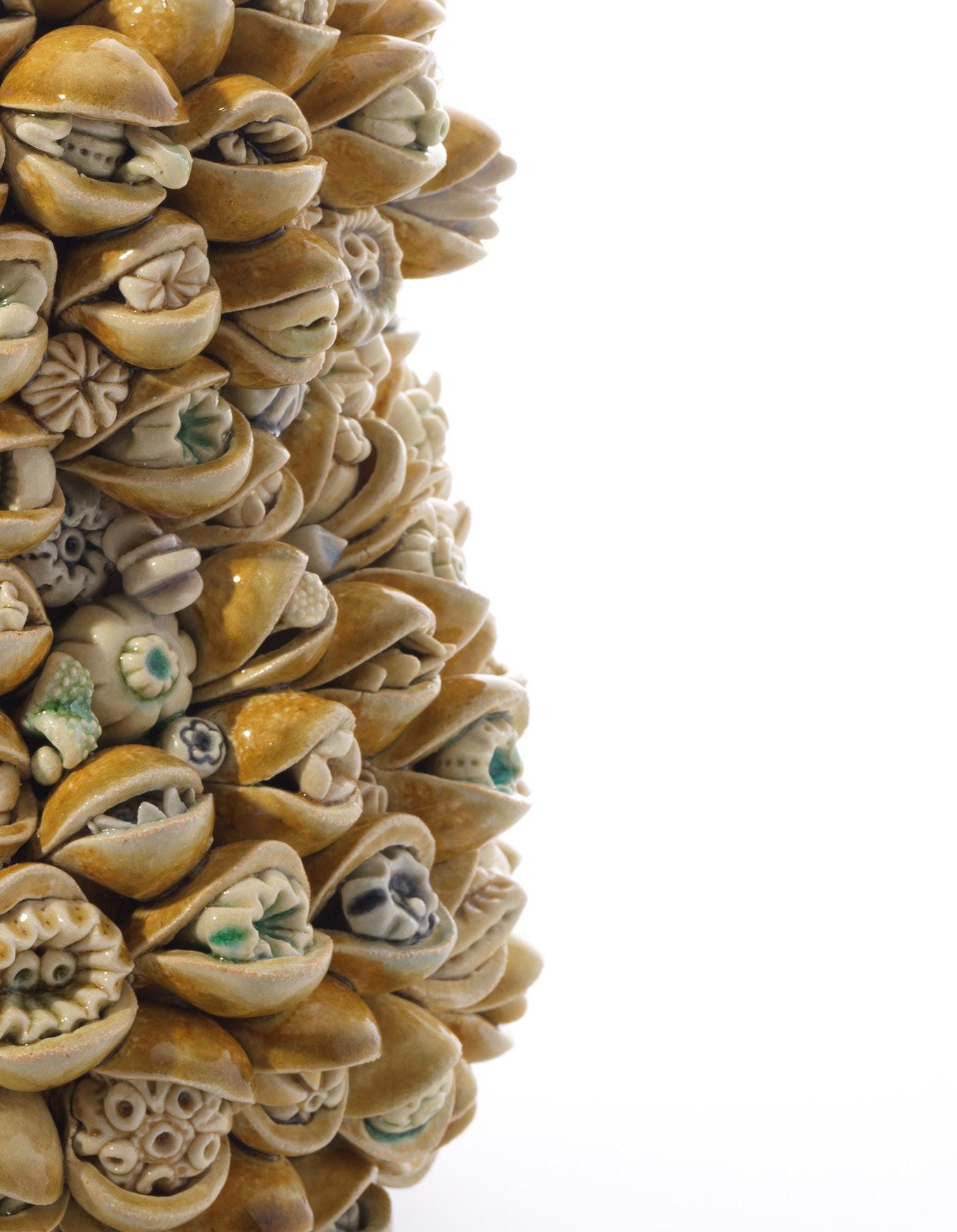 Kate’s primary focus has been the single vessel. Her many highly varied thrown or press-moulded bodies acting as the bare canvas for the creation of sculptures inspired by the organic world and its diverse fruits.