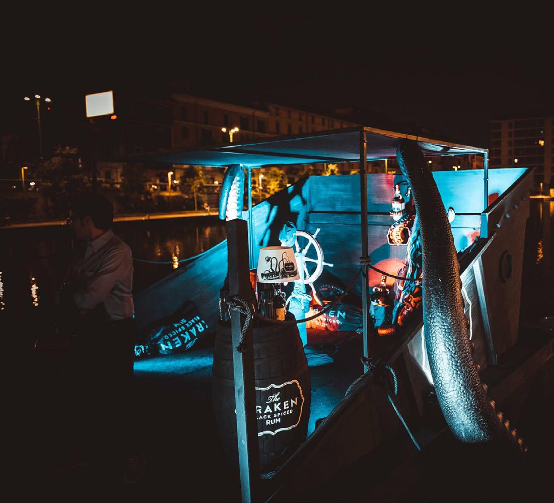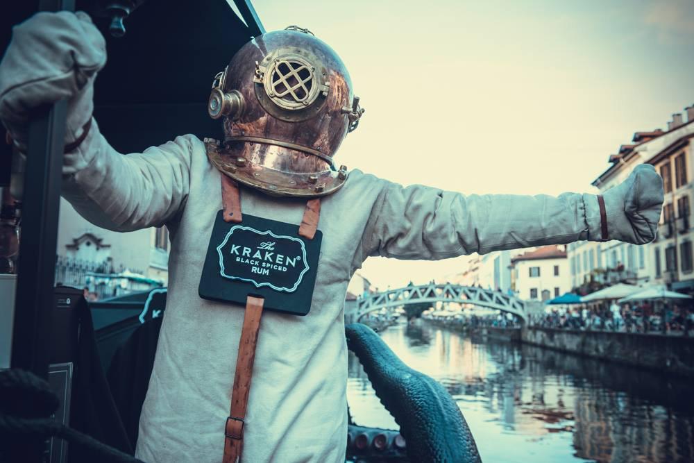 The Kraken Rum, in order to increase its brand awareness, appreciation and market penetration in the Italian market, hosted fan event characterised for sailing across the waters of the Navigli in Milan considered ideal location, not only to recreate the natural habitat of the sea monster, but also for its scenographic impact and the high visibility the area offers, regarding on field and media marketing.