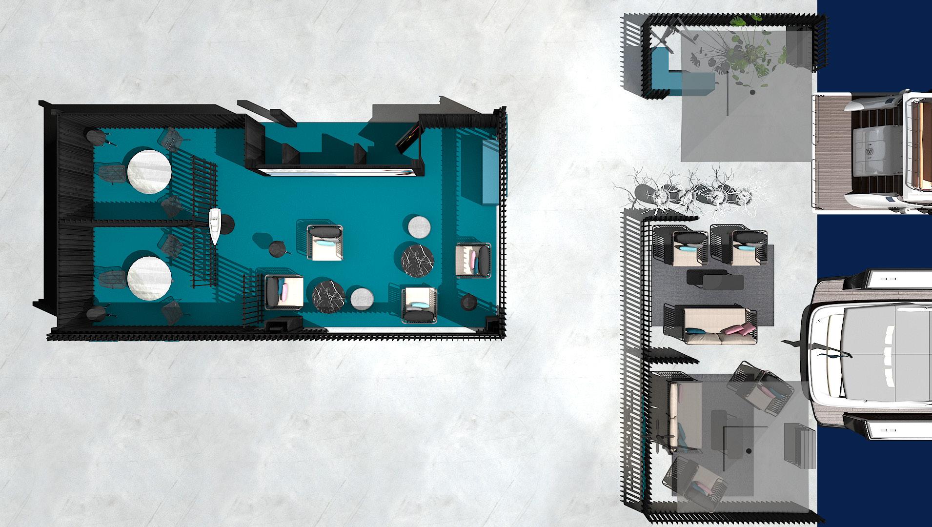 The ourdoor area, a multipurpose space, was used for some more informal business meetings, as a lounge area or as a waiting area before or after the yacht test.