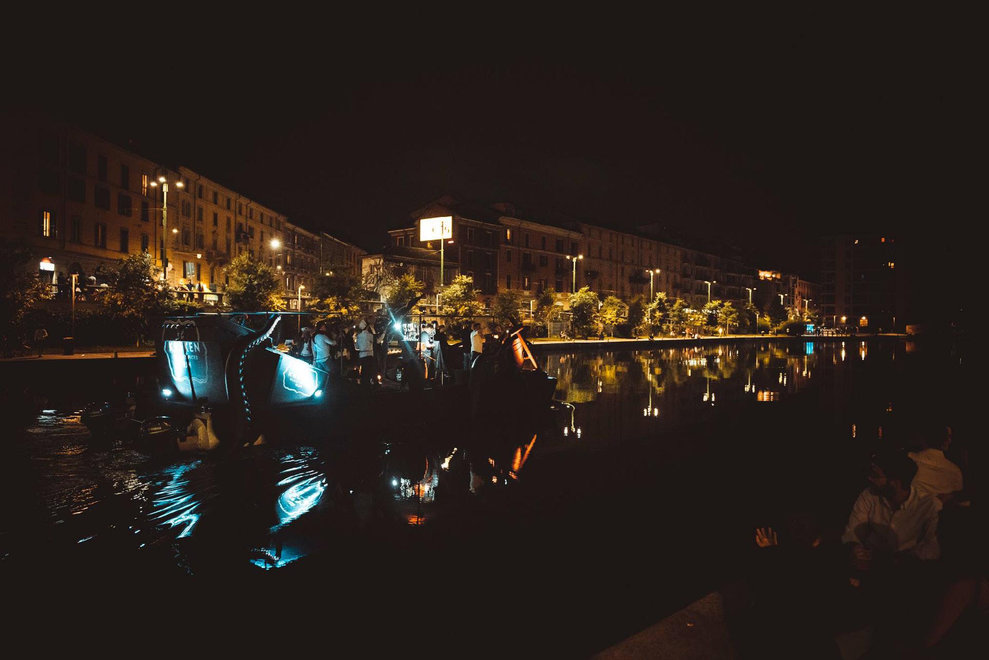 RENDERING + PHOTOMONTAGE BARGE AT NIGHT SAILING THE NAVIGLIO THE KRAKEN INVASION RENDERING EVENT PRODUCTION .04B
