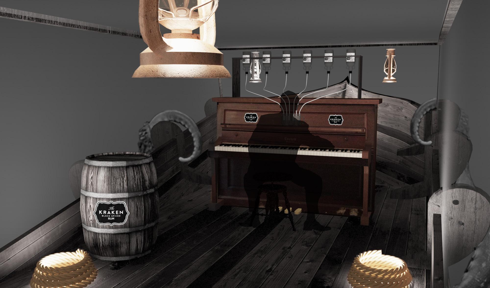 The last weekend, when consumers were already aware of the brand’s initiative, the barge came into play. Moving across the Navigli, the barge docked outside two different bars each night, becoming a visual attraction for consumers and passers-by alike. A cocktail purchase gave the possibility to come on board, get the cocktail made by the pianist and the pianocktail, and get their photo taken at the photo opp corner. For those who wanted, there was also the possibility to play a Kraken wheel of fortune and try their luck at winning one of the available gadgets.