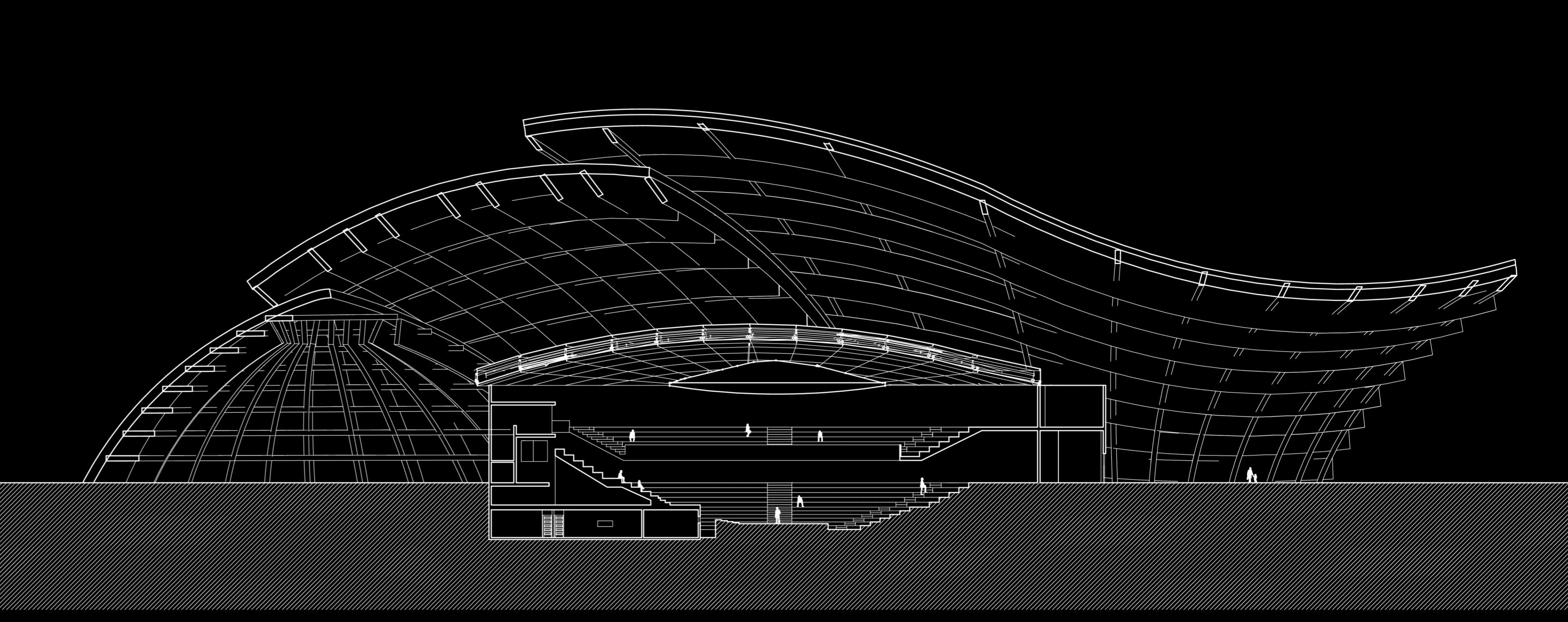 • Cubierta interior de material ligero, con forma de velas convenxas que rodean el auditorio definiendo el sonido del lugar, estos reflectores acústicos están cuidadosamente formados en ángulo para proporcionar la reflexion acústica optima o la absorcion.