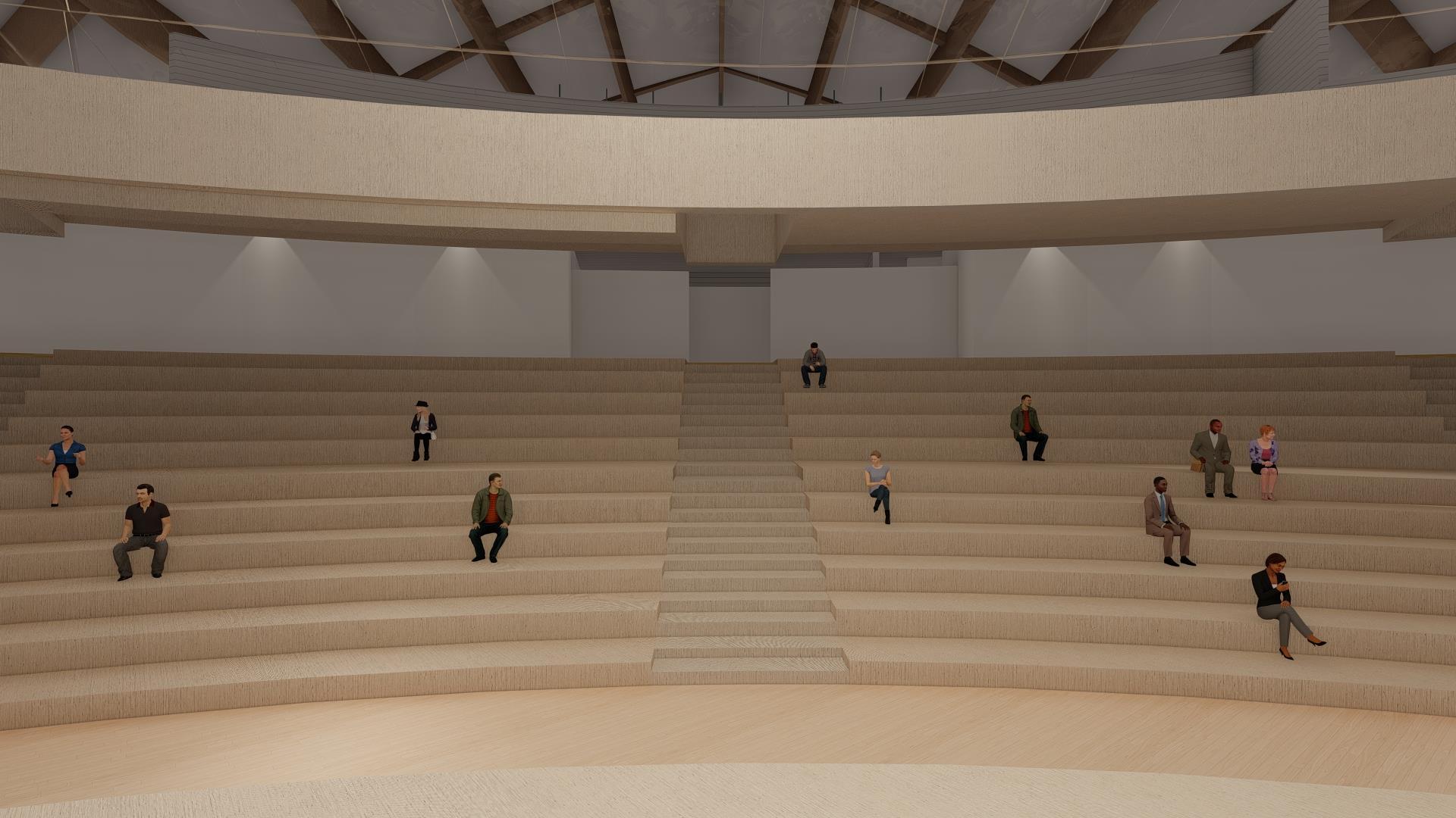 A través de su forma curva permite que el rebote del sonido vaya en diferentes direcciones además de aislar sonidos exteriores que puedan interferir con la experiencia de los usuarios por medio de la materialidad.