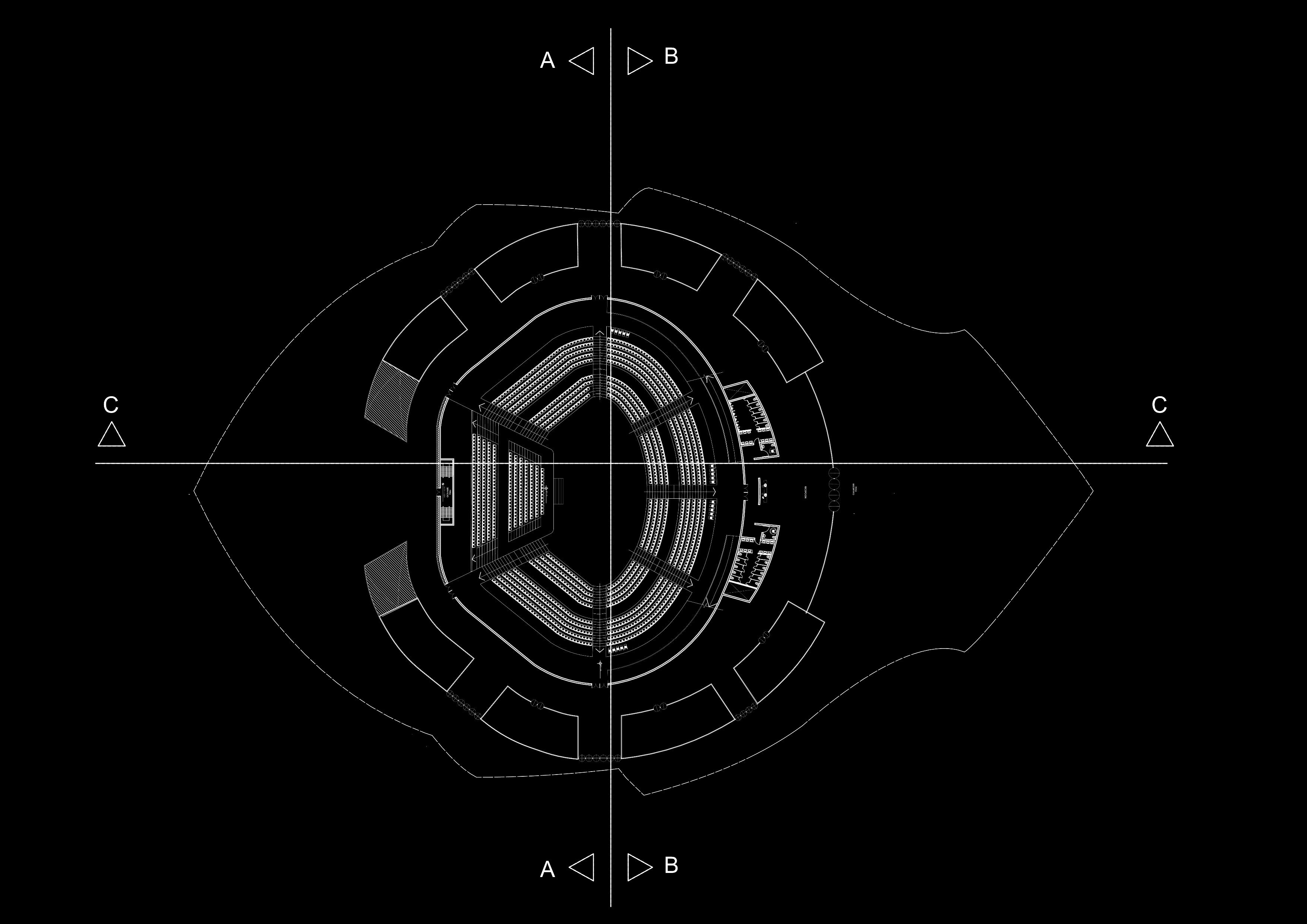 El corazón del edificio es la sala de conciertos que ocupa un tambor ovalado que está rodeado por un grupo de presión de forma irregular.