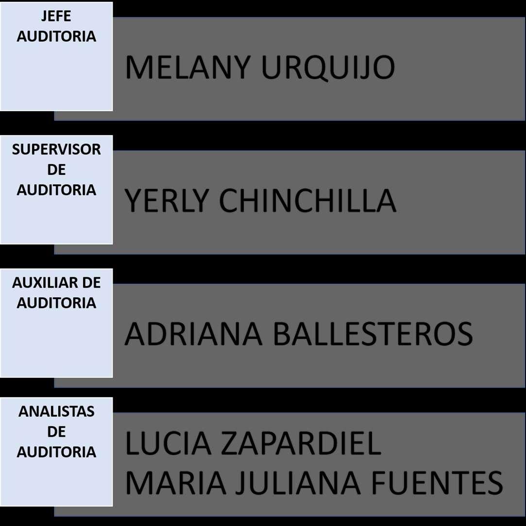 ❖ Responsable(s) Melany Urquijo Florez quien será la jefe auditora, Yerly Chinchilla quien será supervisora de auditoría, auditora auxiliar Adriana Ballesteros, Y Lucia Zapardiel y María Juliana Fuentes quienes serán los auditores analistas.