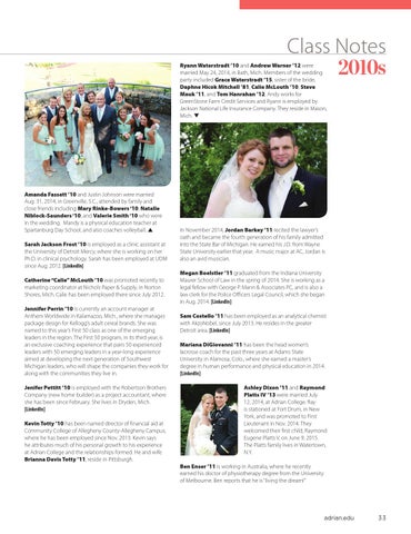 Amanda Fassett ’10 and Justin Johnson were married Aug. 31, 2014, in Greenville, S.C., attended by family and close friends including Mary Rinke-Bowers ‘10, Natalie Niblock-Saunders ‘10, and Valerie Smith ‘10 who were in the wedding. Mandy is a physical education teacher at Spartanburg Day School, and also coaches volleyball. ▲ Sarah Jackson Frost ’10 is employed as a clinic assistant at the University of Detroit Mercy, where she is working on her Ph.D. in clinical psychology. Sarah has been employed at UDM since Aug. 2012. [LinkedIn] Catherine “Calie” McLouth ’10 was promoted recently to marketing coordinator at Nichols Paper & Supply, in Norton Shores, Mich. Calie has been employed there since July 2012. Jennifer Perrin ’10 is currently an account manager at Anthem Worldwide in Kalamazoo, Mich., where she manages package design for Kellogg’s adult cereal brands. She was named to this year’s First 50 class as one of the emerging leaders in the region. The First 50 program, in its third year, is an exclusive coaching experience that pairs 50 experienced leaders with 50 emerging leaders in a year-long experience aimed at developing the next generation of Southwest Michigan leaders, who will shape the companies they work for along with the communities they live in. Jenifer Pettitt ’10 is employed with the Robertson Brothers Company (new home builder) as a project accountant, where she has been since February. She lives in Dryden, Mich. [LinkedIn] Kevin Totty ’10 has been named director of financial aid at Community College of Allegheny County-Allegheny Campus, where he has been employed since Nov. 2013. Kevin says he attributes much of his personal growth to his experience at Adrian College and the relationships formed. He and wife Brianna Davis Totty ’11, reside in Pittsburgh.