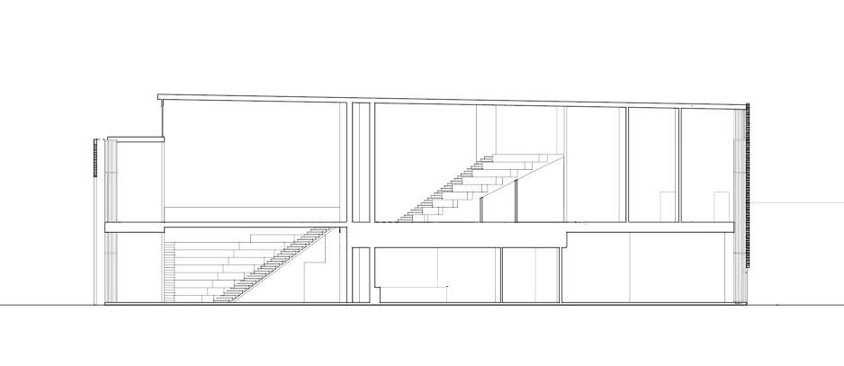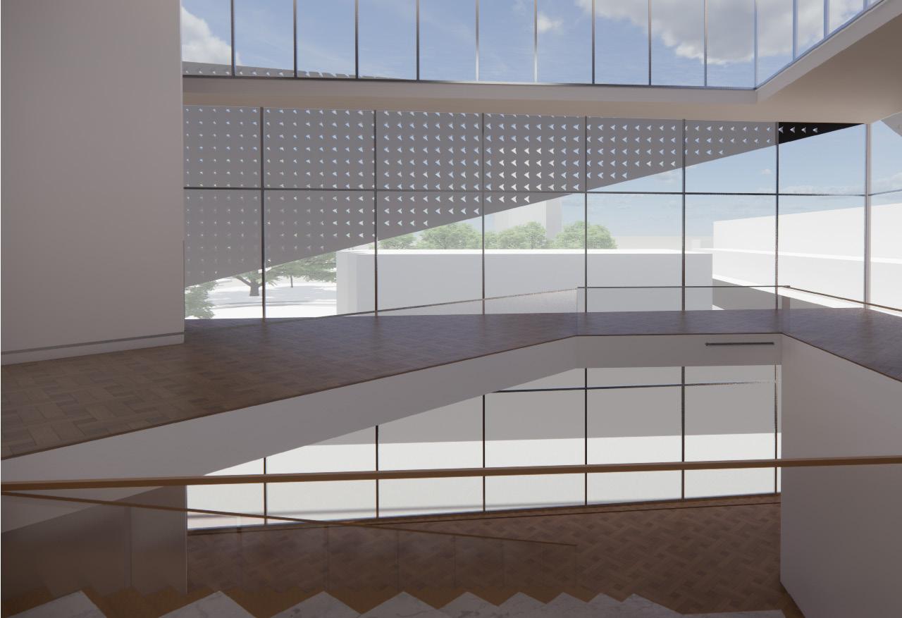 The sun shading device further contributes to the idea of expansive and compressive movement through the building.