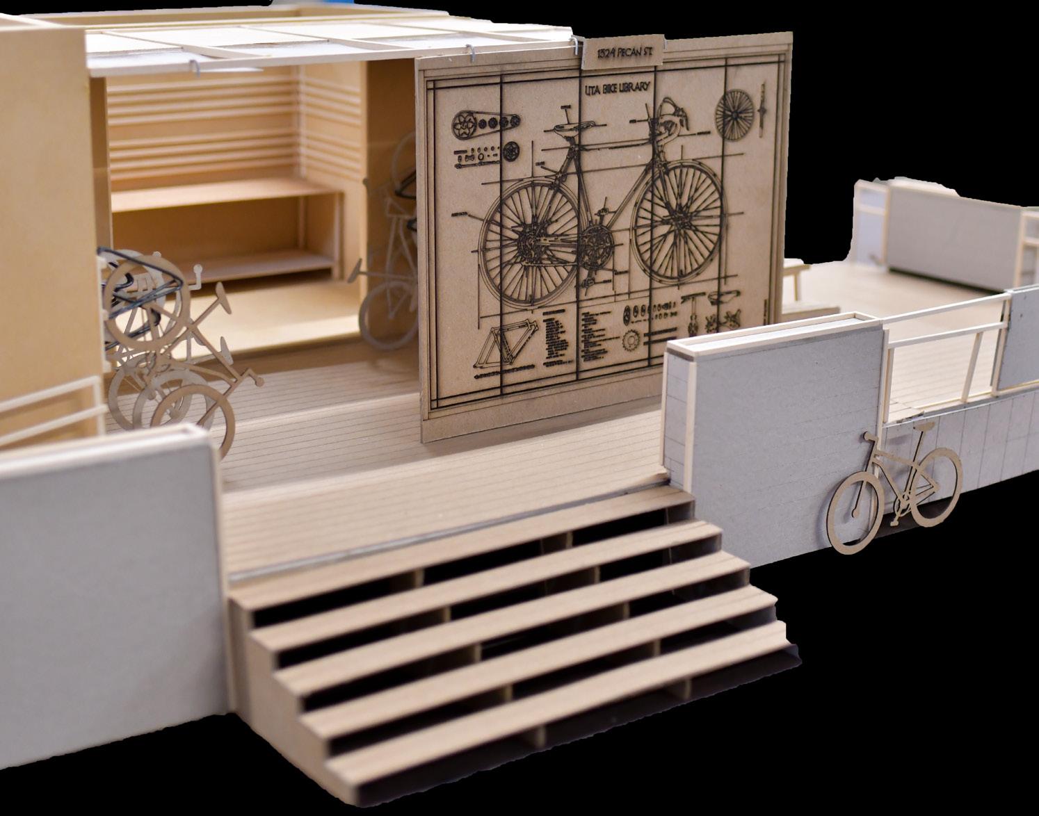 THIS DESIGN BUILD PROJECT TAKES A TINY HOUSE AND TURNS IT INTO A NEW BIKE SHOP FOR THE UNIVERSITY OF TEXAS AT ARLINGTON’S CAMPUS. ITS LOCATION ALONG THE NEW CITY BIKE TRAIL WILL HELP CONNECT THE CITY TO THE UNIVERSITY.