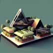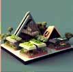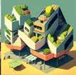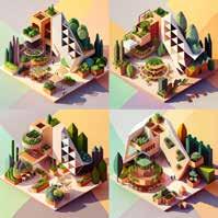Pace, A. (2023). Prompt Version 03 , Midjourney image, [Prompt: “modern geometric architecture, food center design with multiple smaller buildings including vertical gardens and roof gardens with outdoor communal spaces”]