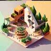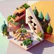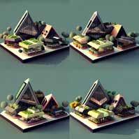 PROMPT VERSION 02 modern geometric architecture, food center design with multiple smaller buildings including vertical gardens