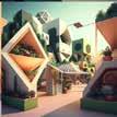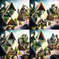 Pace, A. (2023). Prompt Version 02 , Midjourney image, [Prompt: “modern geometric architecture, food center design with multiple smaller buildings including vertical gardens”]