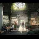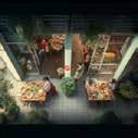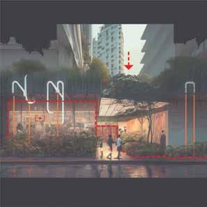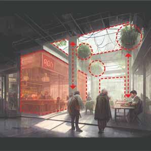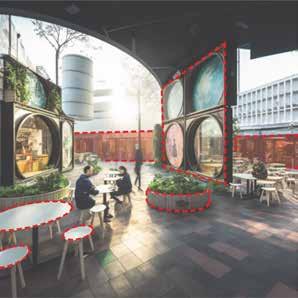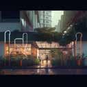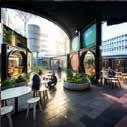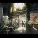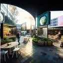 Prompt 05 shows a visulisations that demonstrates a large outdoor communal space that included dining spaces that will help to encourage users to connect with each other. The space also includes active storefront windows for cafes/restaurants which increases user engagement. Throughout the space there are diving glass walls that help to contain a space but also allows visual connection between users through these glass windows.