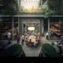 This visualization depicts a walkway that is leading into a large open communal dining space. The use of open cafe and restaurant front allows users to populate this walkway space which helps to invite new users to explore this space and connect with each other. The larger communal dining space beyond provides an ideal place for users to come together and socialise with friends and family. The space lacks the element of height and greenery which could be included by altering the prompts and rankings