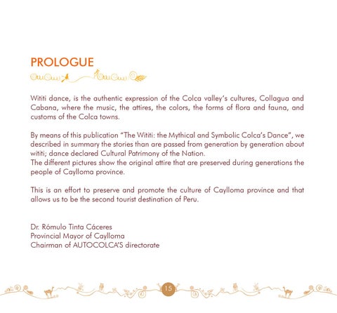 PROLOGUE Wititi dance, is the authentic expression of the Colca valley’s cultures, Collagua and Cabana, where the music, the attires, the colors, the forms of flora and fauna, and customs of the Colca towns. By means of this publication “The Wititi: the Mythical and Symbolic Colca’s Dance”, we described in summary the stories than are passed from generation by generation about wititi; dance declared Cultural Patrimony of the Nation. The different pictures show the original attire that are preserved during generations the people of Caylloma province. This is an effort to preserve and promote the culture of Caylloma province and that allows us to be the second tourist destination of Peru. Dr. Rómulo Tinta Cáceres Provincial Mayor of Caylloma Chairman of AUTOCOLCA’S directorate