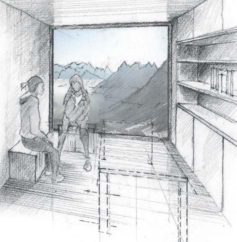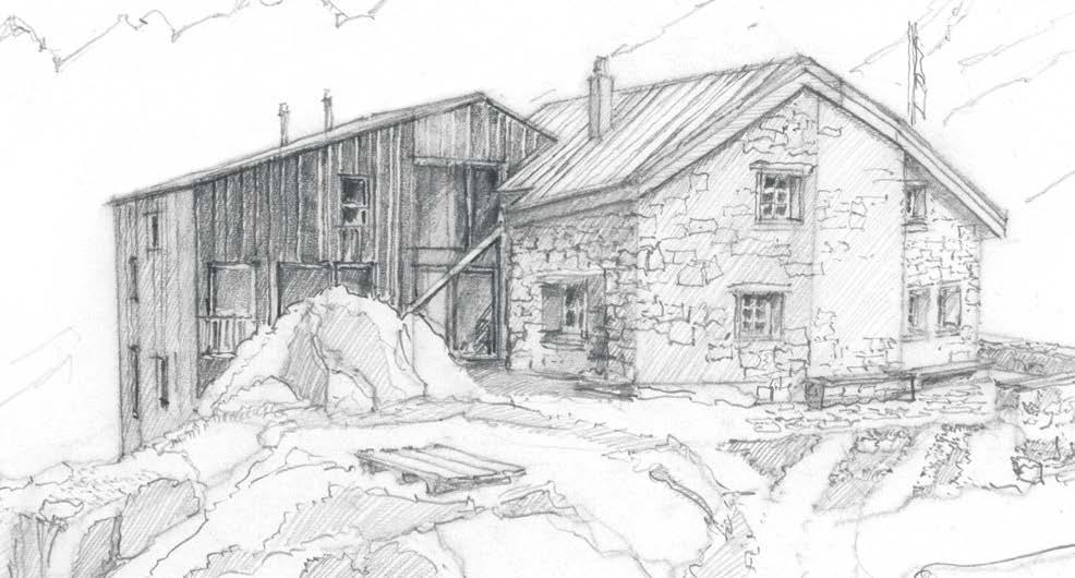 Die Architekten wählten eine pragmatische Nutzung: Küche, Aufenthaltsraum, Schutzraum und Gästezimmer befinden sich im bestehenden Hüttenteil, Personalund Nebenräume sind im Anbau. Küche, Lager und Warenanlieferung liegen im EG, Gästezimmer im 1. OG, Sanitärräume und Technik im 1. UG.