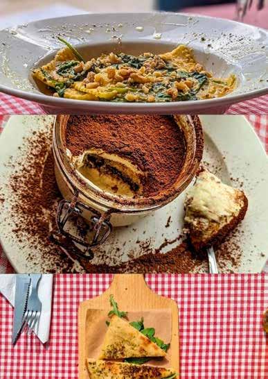 ETEN We genieten van ravioli met pompoen, een pesto-ricotta-pizza en focaccia met oregano. Al het eten is vegan, verwacht dus niet de smaak van normale kaas. Het deeg van de pizza en focaccia is heerlijk luchtig. De andere gerechten met gegrilde groenten zien er ook veelbelovend uit.