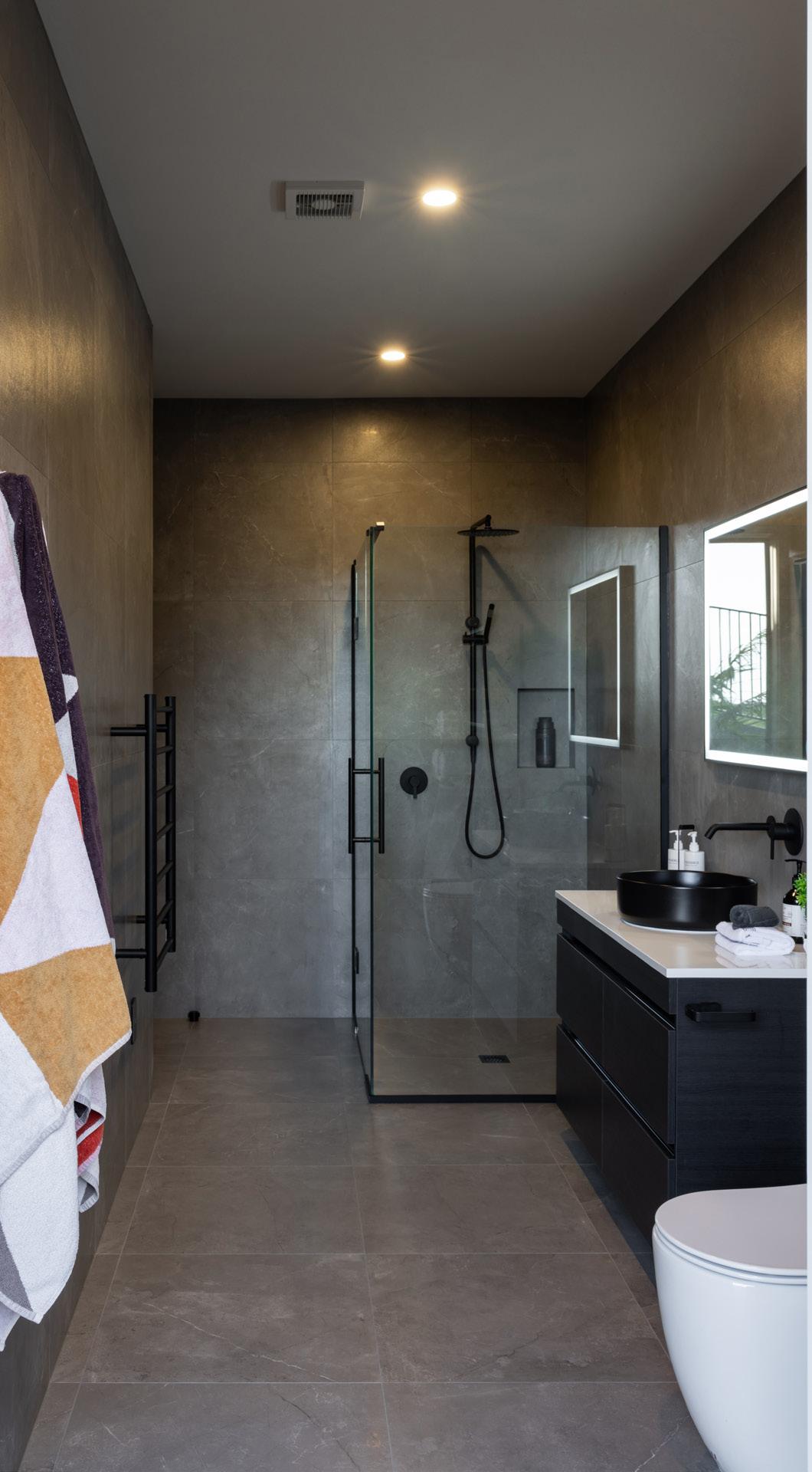Truly bespoke design is this home, featuring a 3 degree raking ceiling throughout the main living area, dark wood kitchen cabinetry, timber laminate flooring and a stunning engineered stone benchtop. Exterior cladding showcases the natural ecogroove cladding paired with off-white vertical groove cladding for an effective ‘beachy’ look.