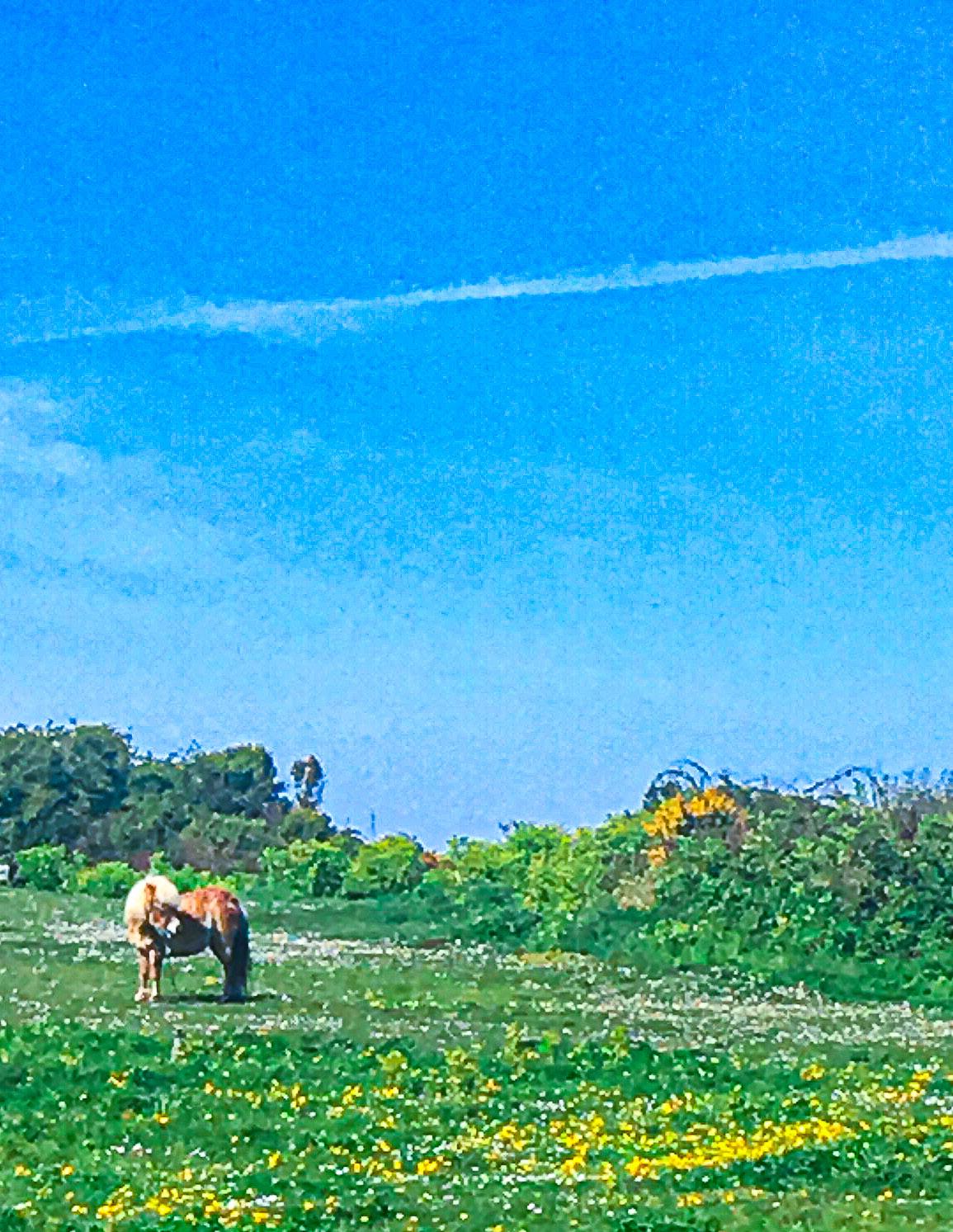A soft-haired, blonde-maned pony in a field of flowers