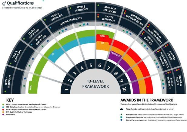 The National Framework of Qualifications was established to create a coherent structure for the development and recognition of all awards within the Irish education system. It is founded on the principles of learning outcomes which identify the level of knowledge, skills and competence a learner should attain to achieve an award placed on the framework. It is a ten-level system (1–10) giving an academic or vocational value to qualifications obtained in Ireland. Each level is based on nationally agreed standards of what a learner is expected to know and be able to do after receiving an award. www.qqi.ie