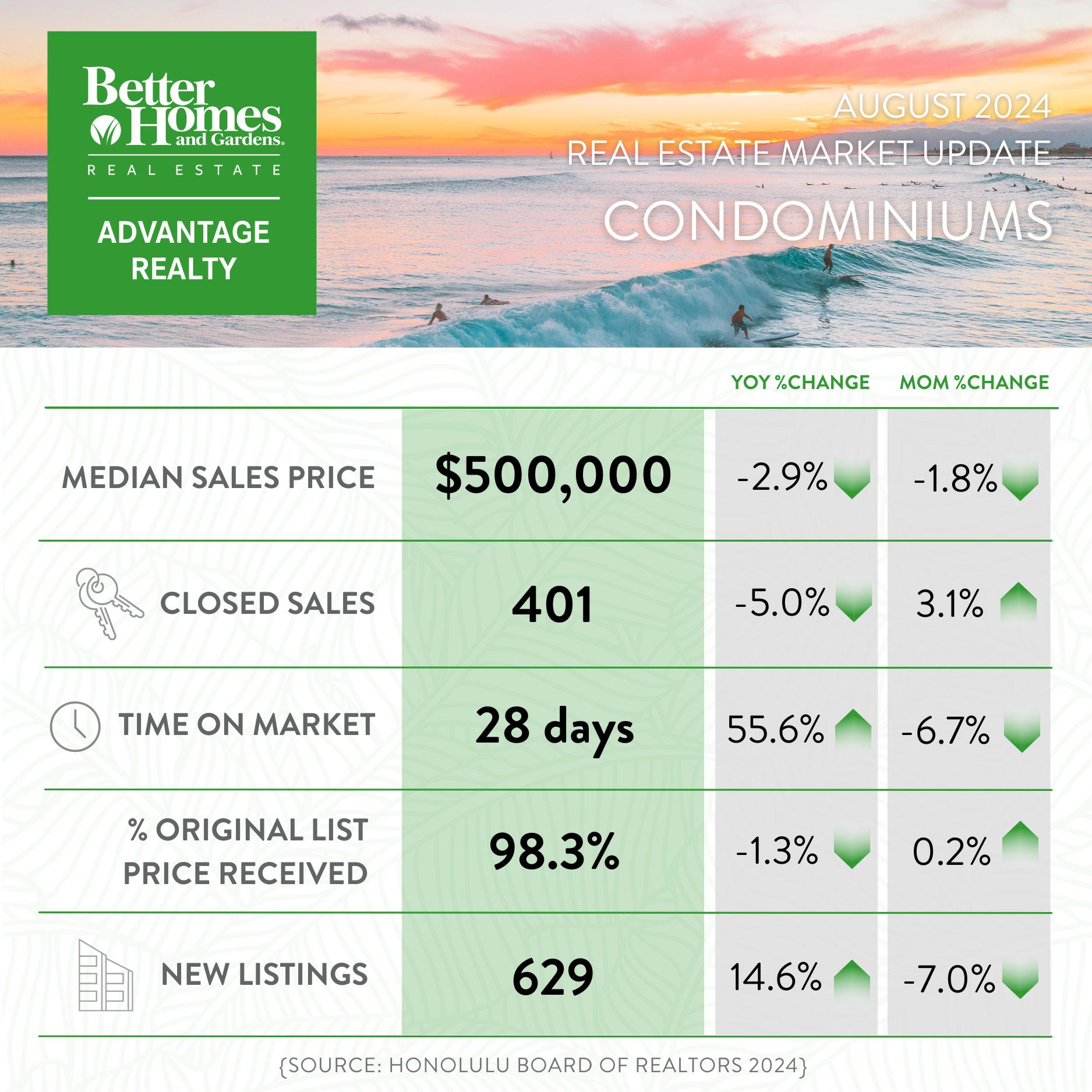 More new listings came on the market compared to a year ago with 346 single-family homes, up 4.8% year-over-year, and 629 condos or 14.6% more than August 2023. Every region throughout the island offered buyers a selection of new single-family home listings last month. ‘Ewa Plain added the most new listings, 56 for the month, followed by the Diamond Head region at 45 new listings, and the Pearl City region at 39 new listings. In the condo market, new listings in the Metro region rose 13.9% year-over-year with 394 condos listed throughout the month.
