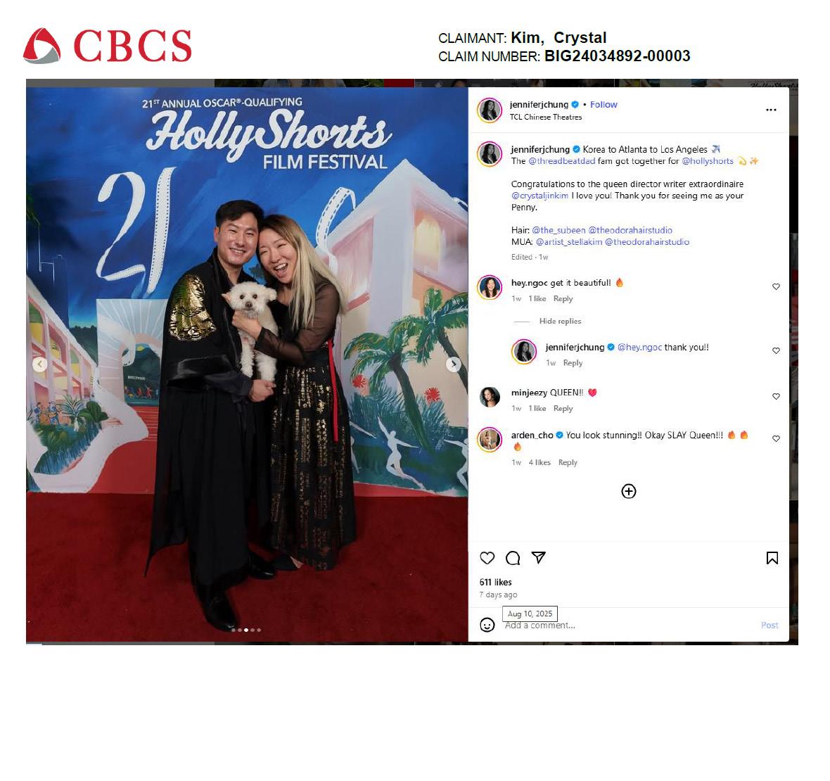 REAL RESULTS : The Claimant posted an aerial video of herself, and a man believe to be Co-Claimant Judo Jang, walking on a beach dated 5/29/2025. Since the date of loss, the Claimant appears to have been co-producing a film with Co-Claimant and husband Judo Jang. They have also attended several red carpet events, in Atlanta, Korea, and Los Angeles. They can also be seen in posts on the set of the film which they were working on.