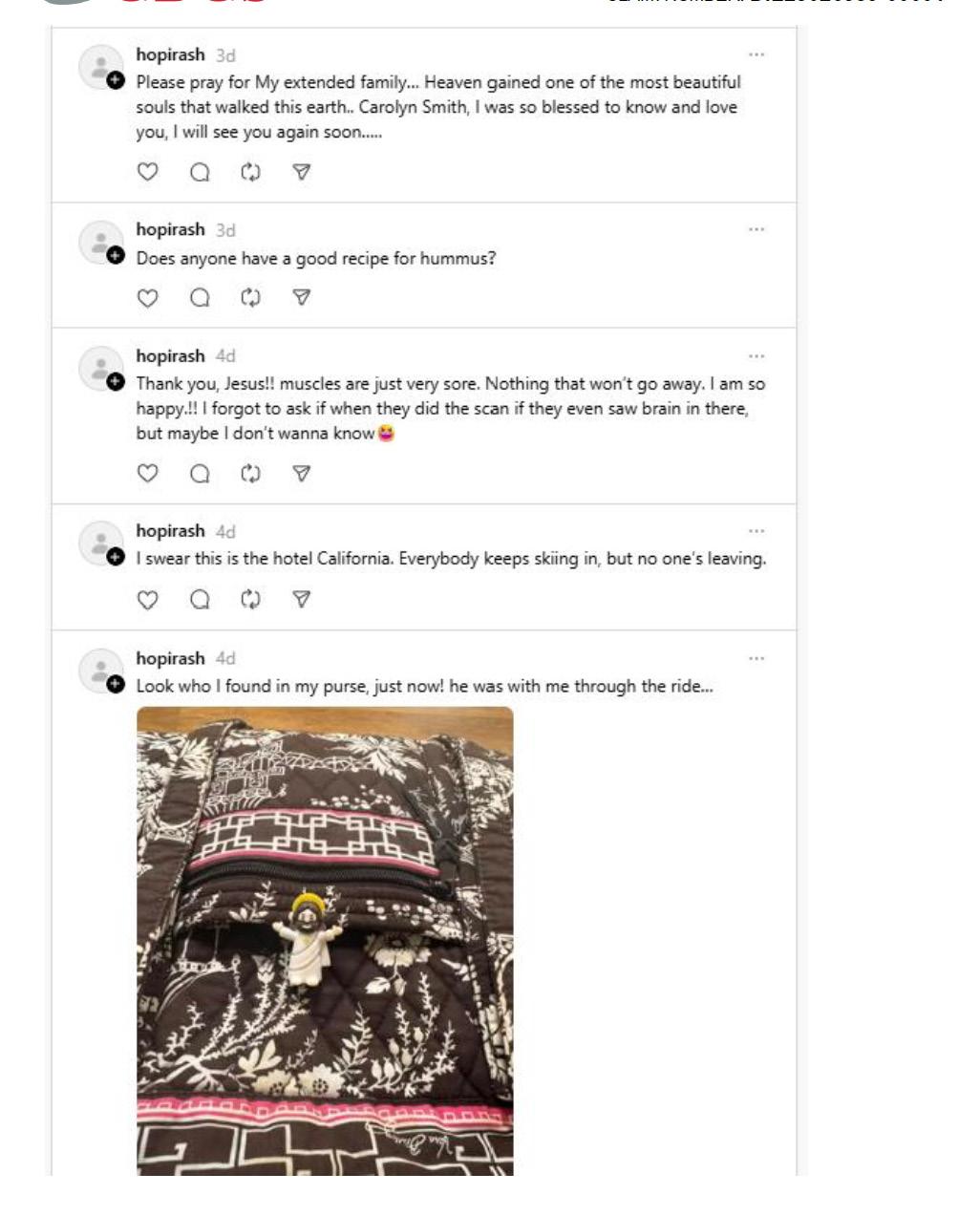 REAL RESULTS : The Claimant posted on the DOL and 1-day post-DOL. On 08/08/2025, she posted a photo of a Jesus figure, “Look who I found in my purse, just now! He was with me through the ride…” On 08/07/2025, “Y’all please pray for me of course I’m shook up very much but I also have a tremendous headache. I’ve taken medicine but so far it’s not helping so please do pray that headache goes away.” On 08/07/2025 and 08/08/2025, she posted Threads comments about her automobile accident, including information about her injuries, the circumstances of the accident, and a request for referrals to a chiropractor.