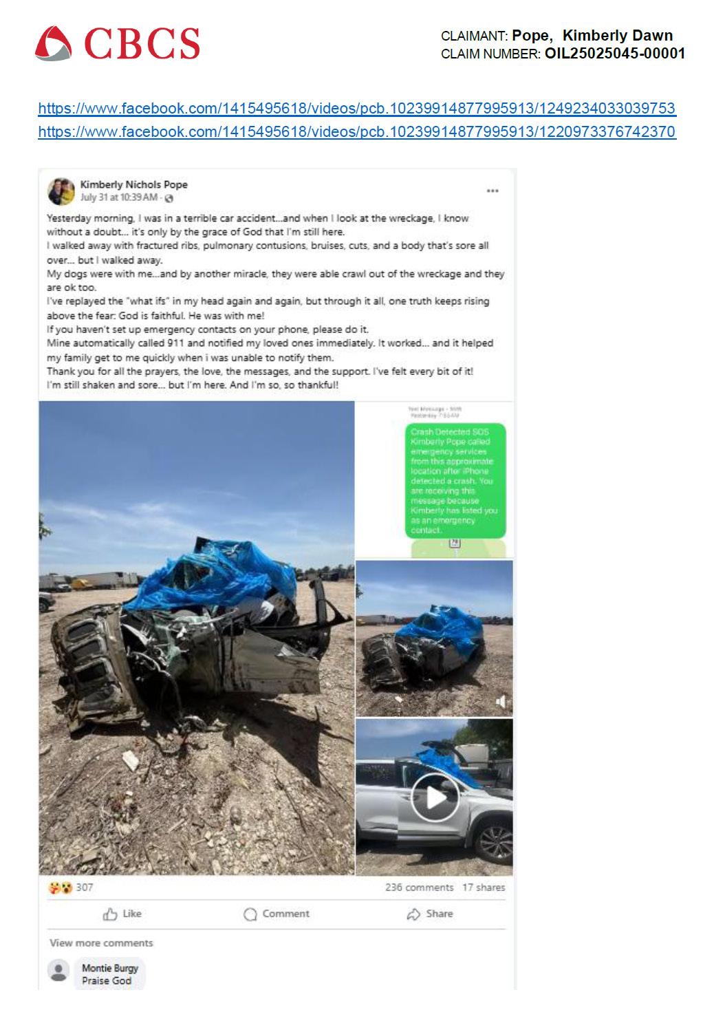 REAL RESULTS : The Claimant posted information about an automobile accident with photos and videos on Facebook on 07/31/2025. In the post she noted, “I walked away with fractured ribs, pulmonary contusions, bruises, cuts, and a body that’s sore all over… but I walked away.” She also noted her dogs were in the vehicle at the time of the accident but were “ok”.