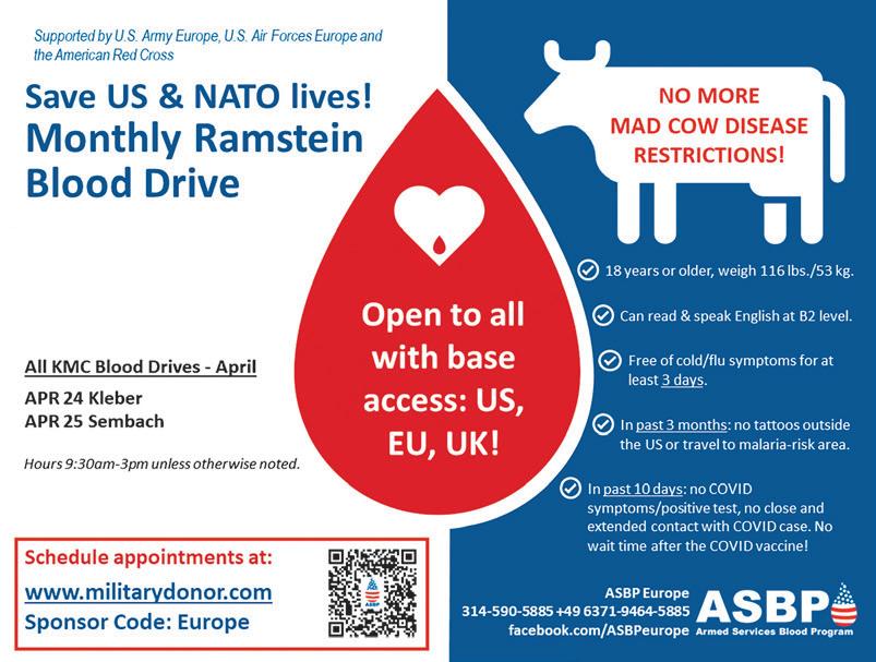 The ACS Army Volunteer Corps will host the USAG Rheinland-Pfalz Volunteer Recognition Ceremony on April 21 from 6 to 8 p.m. at Armstrong’s Club in Building 1036 on Vogelweh Housing. This event celebrates the exceptional contributions made by volunteers throughout the Garrison in 2022. All Department of Defense ID Cardholders are welcome to attend this free event. For more information, visit kaiserslautern. armymwr.com.