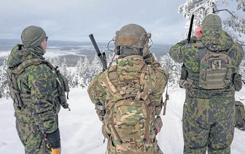 A Finnish Tactical Air Control Party operator and U.S. TACP Airmen assigned to the 435th Air Ground Operations Wing prepare to call in close-air support from a B-52H Stratofortress at Rovajarvi firing range, Finland, March 6.
