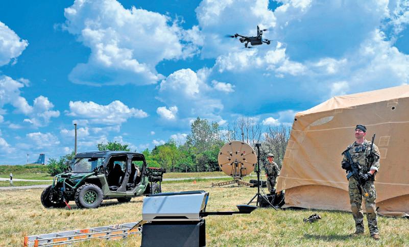 U.S. Air Force Airmen, from the 435th Contingency Response Element, watch a drone automatically return to its launch platform during exercise Swift Response 24, at Kecskemet Air