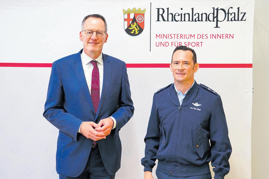 Maj. Gen. Paul D. Moga, Third Air Force and Kaiserslautern Military Community commander, and Michael Ebling, State Minister of the Interior of RheinlandPfalz, meet to sign a cooperation agreement establishing a partnership between the KMC and the Police Presidium West Palatinate with the aim of preventing and reducing DUI offenses in the area July 15.
