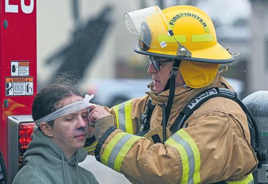(Right) A U.S. Air Force firefighter assigned to the 86th Civil Engineer Squadron gives medical care to a roleplayer following a simulated aircraft fire during exercise Operation Varsity 24-3 on Ramstein Air Base, Nov. 18.