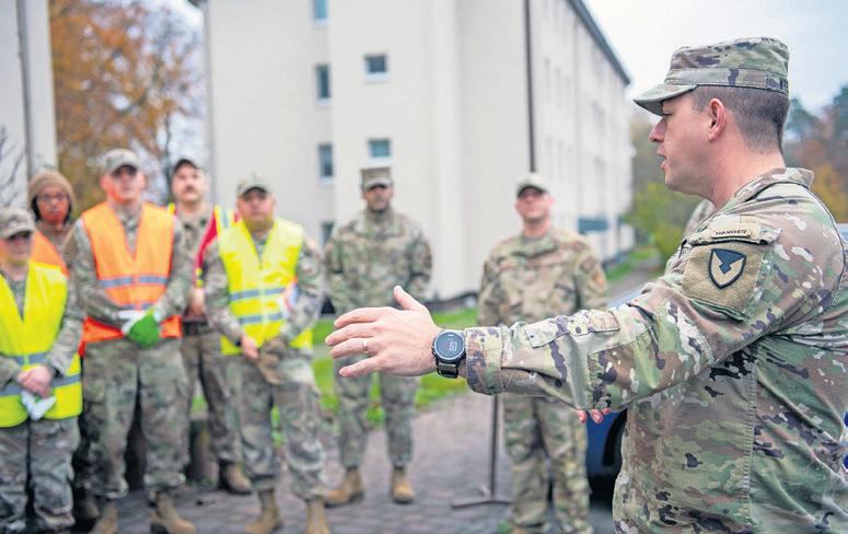 U.S. Army Command Sgt. Maj. Raymond Wrensch, U.S. Army Garrison Rheinland-Pfalz senior enlisted advisor, speaks to volunteers before cleaning base housing at Vogelweh Military Complex, Nov. 15. U.S. Air Force and U.S. Army personnel joined together as a part of the Kaiserslautern Military Community Fall Clean-Up Day to clear shared storage and outdoor areas in Vogelweh housing.